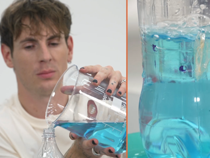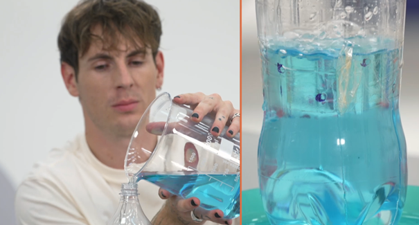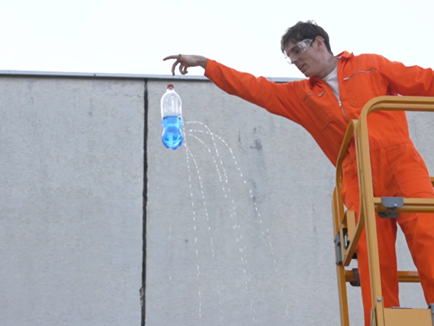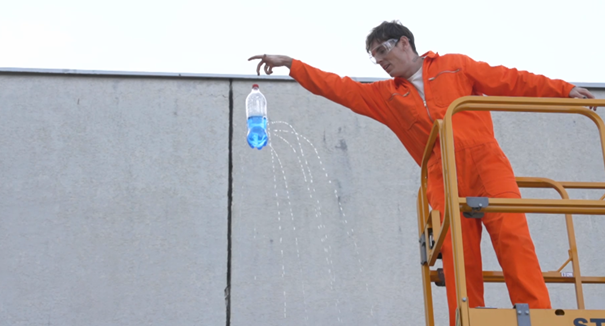 Do plastovej fľaše potrebujeme spraviť dierky na odtok vody. Najlepšie je ich spraviť v dvoch radoch a aspoň 10 dier. Na to, aby ste spravili dierky si zavolajte dospelého. Najlepšie je keď sa dierky robia rozpáleným klincom, ale to môže robiť len dospelý, pretože je to nebezpečné. Dierky by mali ísť spraviť aj ostrejším šraubovákom alebo nožnicami. Keď máme dierky hotové veľmi dobre ich oblepíme jedným kusom lepiacej pásky. Ide o to, aby nám z nich nevytekala voda hneď ako ju nalejeme do fľaše. Keď máme túto časť hotovú, nachystáme si v ďalšej nádobe mix potravinárskeho farbiva a vody. Čím tmavší roztok budeme mať, tým lepšie ho bude vidieť. Keď máme všetko nachystané, môžeme ísť von. Tento pokus je nutné treba robiť z väčšej výšky, aby ho bolo dobre vidno. Postačia aj dva metre. Vonku rýchlo prelejeme do pripravenej fľaše ofarbenú vodu a zavrieme fľašu uzáverom. Keď sme pripravený beztiažový pád vyskúšať, rýchlo odstránime lepiacu pásku, otvoríme uzáver a keď z fľaše začne vytekať voda, spustíme ju z výšky. Voda počas pádu prestane tiecť, pretože sa vo fľaši bude chvíľku nachádzať v beztiažovom stave.