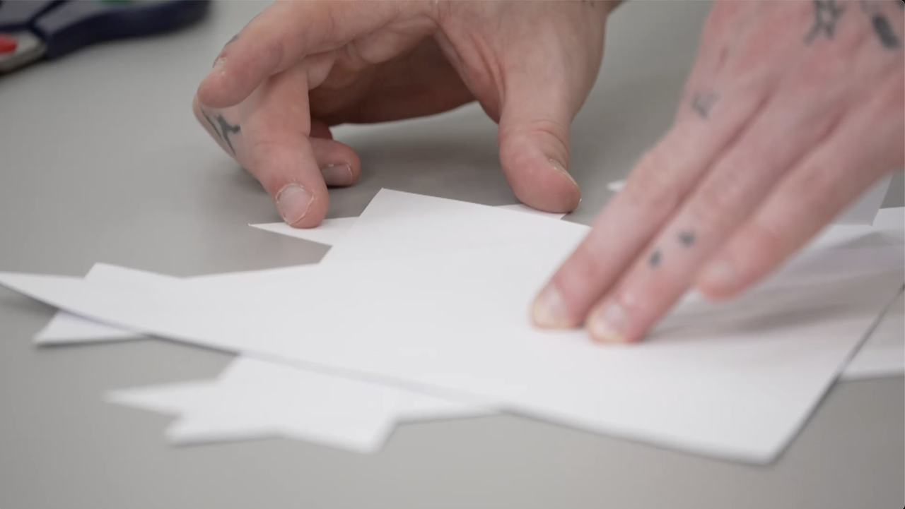 Nebude to presná geometrická práca, o to nejde, chceme vám iba ukázať príklad toho, ako si takú vločku s opakujúcimi vzormi, konkrétne rovnostrannými trojuholníkmi môžeme narysovať, vystrihnúť a poskladať sami.