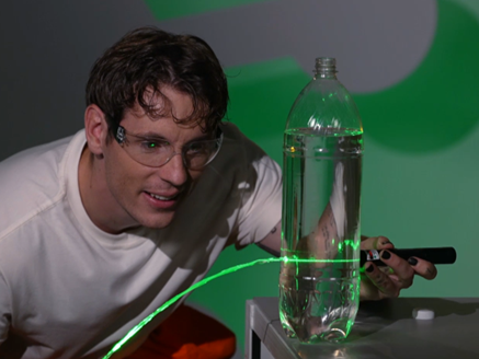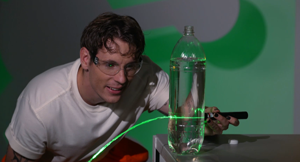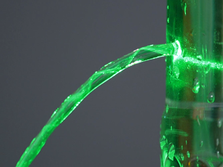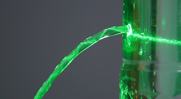 Do plastovej fľaše urobíme okrúhlu dierku v dolnej tretine fľaše. Dosiahneme to napríklad horúcim klincom, aby bola čo najčistejšia. Dierku prelepíme lepiacou páskou. Fľašu zatvoríme viečkom a napustíme vodou. Položíme ju na stôl alebo inú vyvýšenú plochu. Pod ňu si nachystáme vedro, kam bude voda odtekať. Keď sme pripravení, odlepíme lepiacu pásku z dierky a uvoľníme uzáver fľaše. Keď voda začne tiecť, namierime laser kolmo na dierku z druhej strany fľaše.