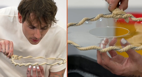 Do plechu nalejeme vodu, pridáme saponát a dobre zamiešame. Tenké kovové ramienko ohneme do guľatého tvaru a obtočíme špagátom. Z nitky si prichystáme kruh široký ako naša päsť a zaviažeme. Keď ramienko namočíme do saponátovej vody a pomaly dvihneme od plechu hore, vznikne nám na ňom mydlová blana. Na ňu hodíme našu nitku a niečím ostrým prepichneme v strede. Povrchové napätie bude pôsobiť tak, že nám nitku rovnomerne roztiahne do všetkých strán. Vo veľkom kruhu ostane mydlová blana a v malom bude diera dosť veľká nato, aby sme ňou prestrčili ruku.