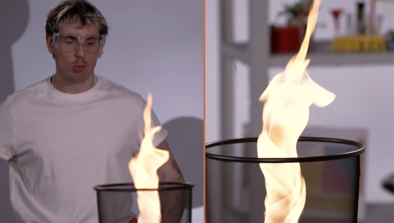 Vytvoríme vzdušný vír tým, že kôš roztočíme. Cez otvory v mriežke sa dnu dostane vzduch, točením podnosu vzniká vzdušný vír a máme ohňové tornádo.