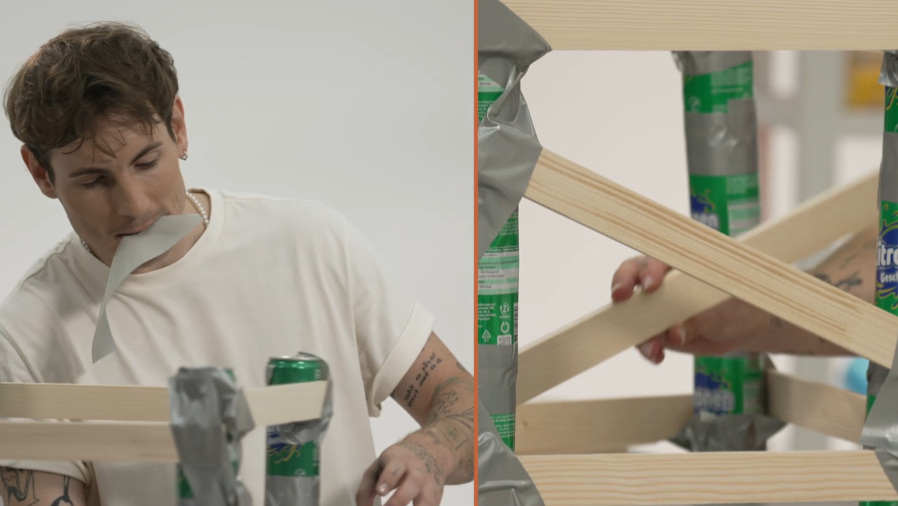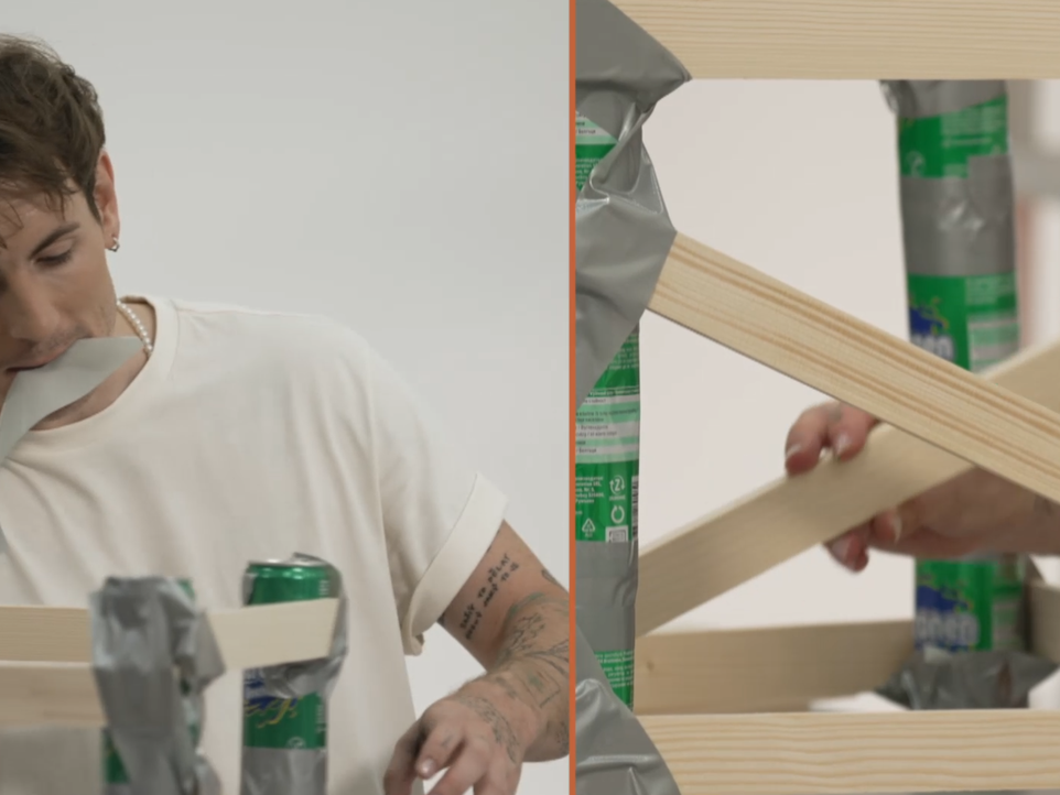 Z piatich plechoviek postavíme nohu stoličky – plechovky položíme na seba a pripevníme ich k sebe pomocou lepiacej pásky.