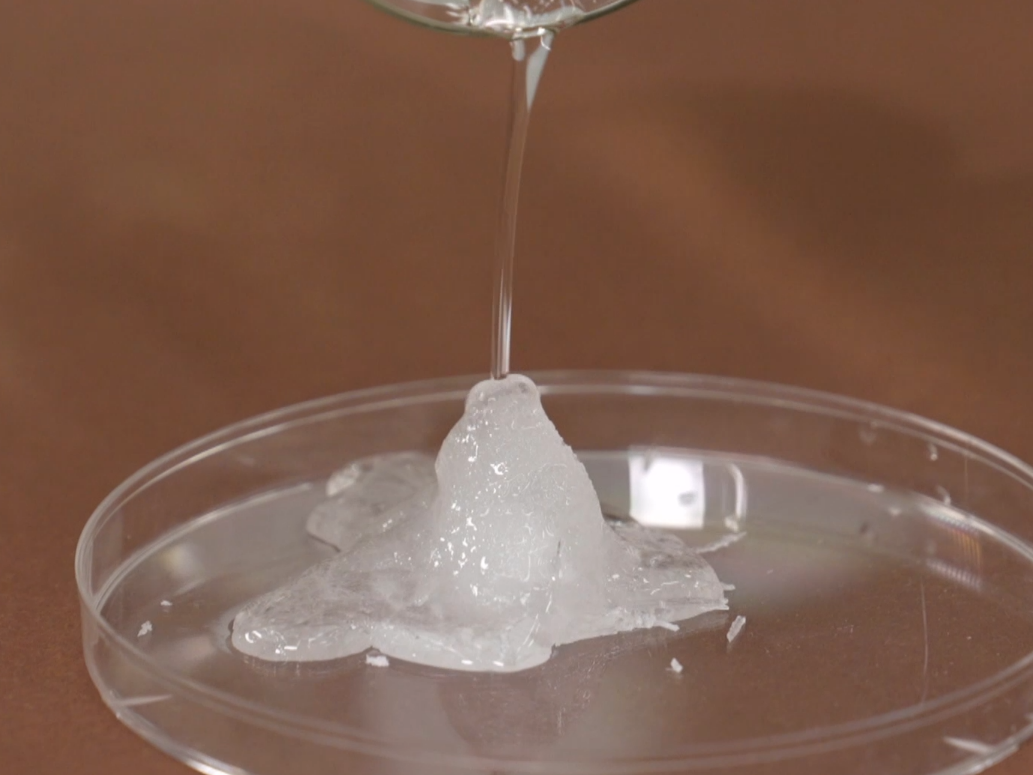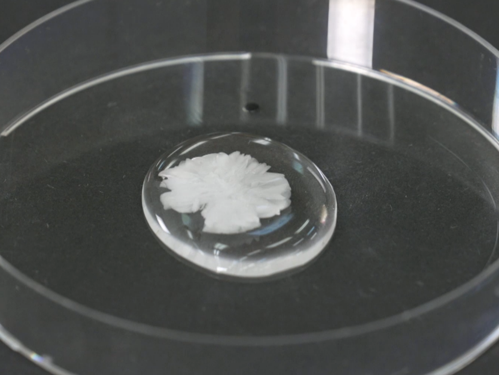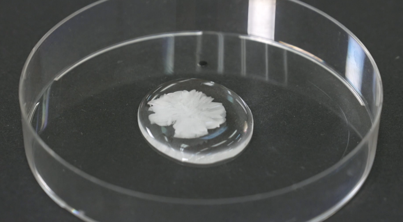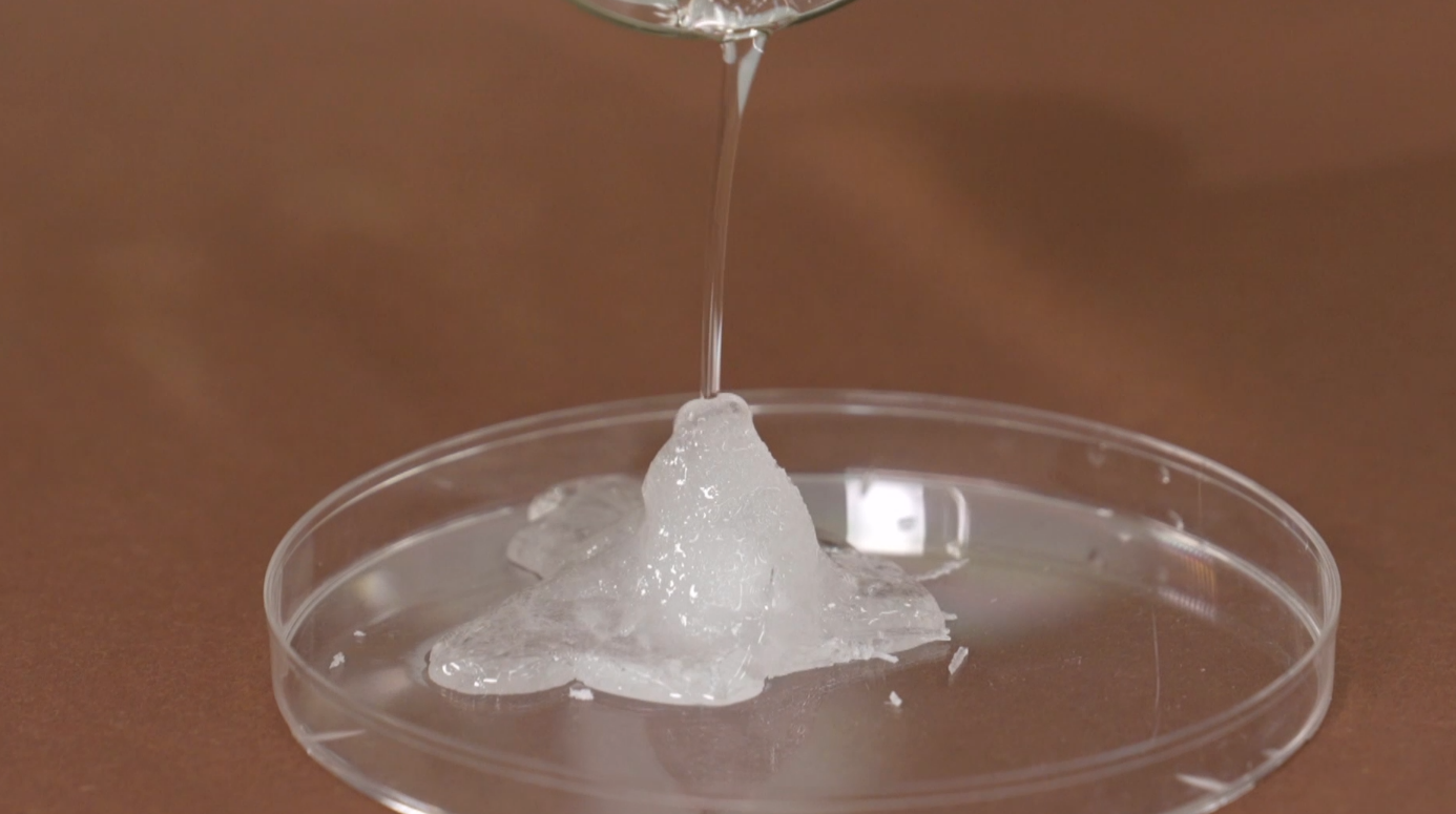 Po 30 minútach roztok veľmi pomaly a opatrne vyberieme z chladničky a presunieme sa k nášmu tanieriku so štartovacím kryštálom. Roztok začneme veľmi veľmi pomaly liať na malý kúsok kryštálu na tanieriku a mal by sa nám vytvárať kvapeľ.